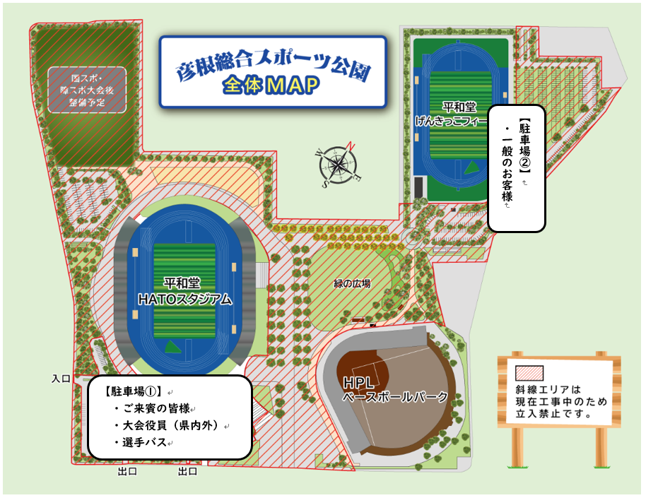①ご来賓の皆様・大会役員(県内外)・選手バス → 平和堂HATOスタジアム西側駐車場(入口:北側、出口:西側)
